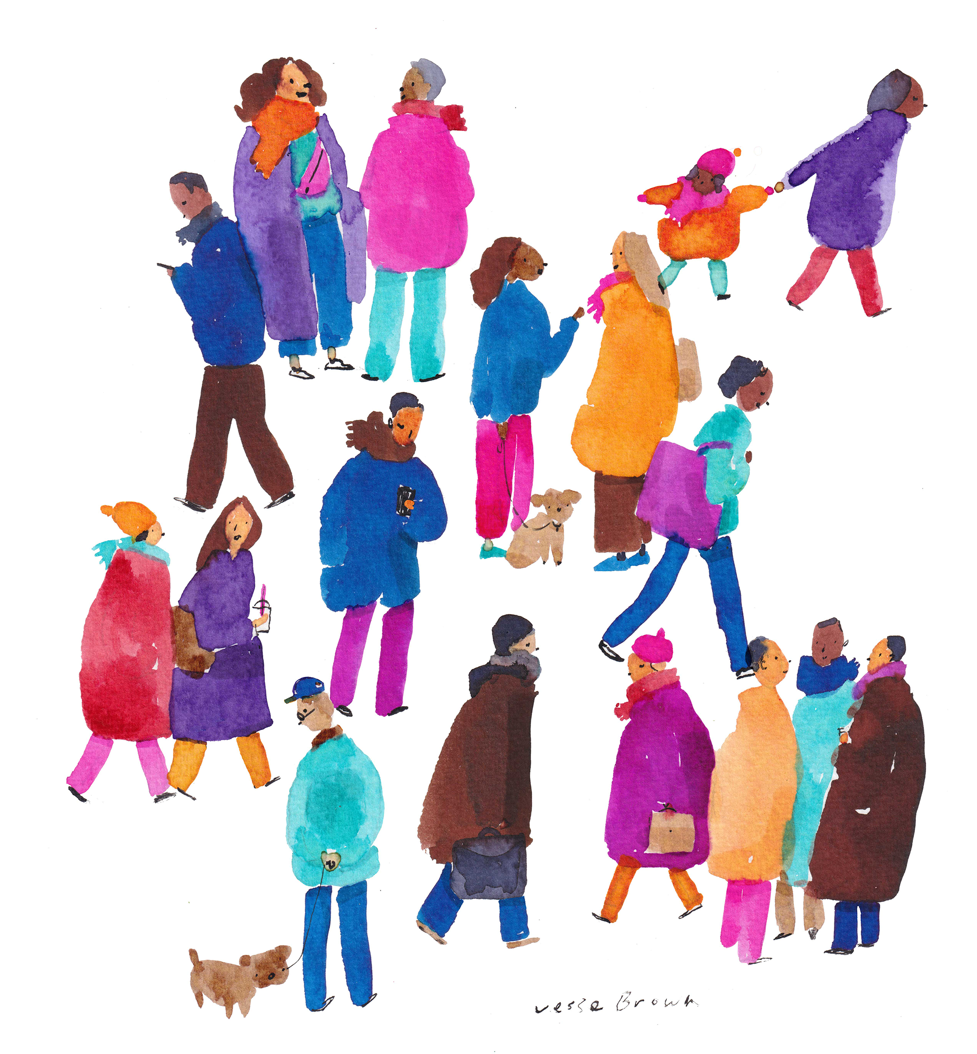 Jesse Brown is a London-based illustrator whose work is inspired by everyday life in the city. Through observation and wandering, he captures small moments and fleeting interactions between people in public spaces. Working with watercolour, ink and mixed media, Brown’s illustrations reflect a quiet attentiveness to the rhythms of urban life and the subtle stories found on London’s streets.